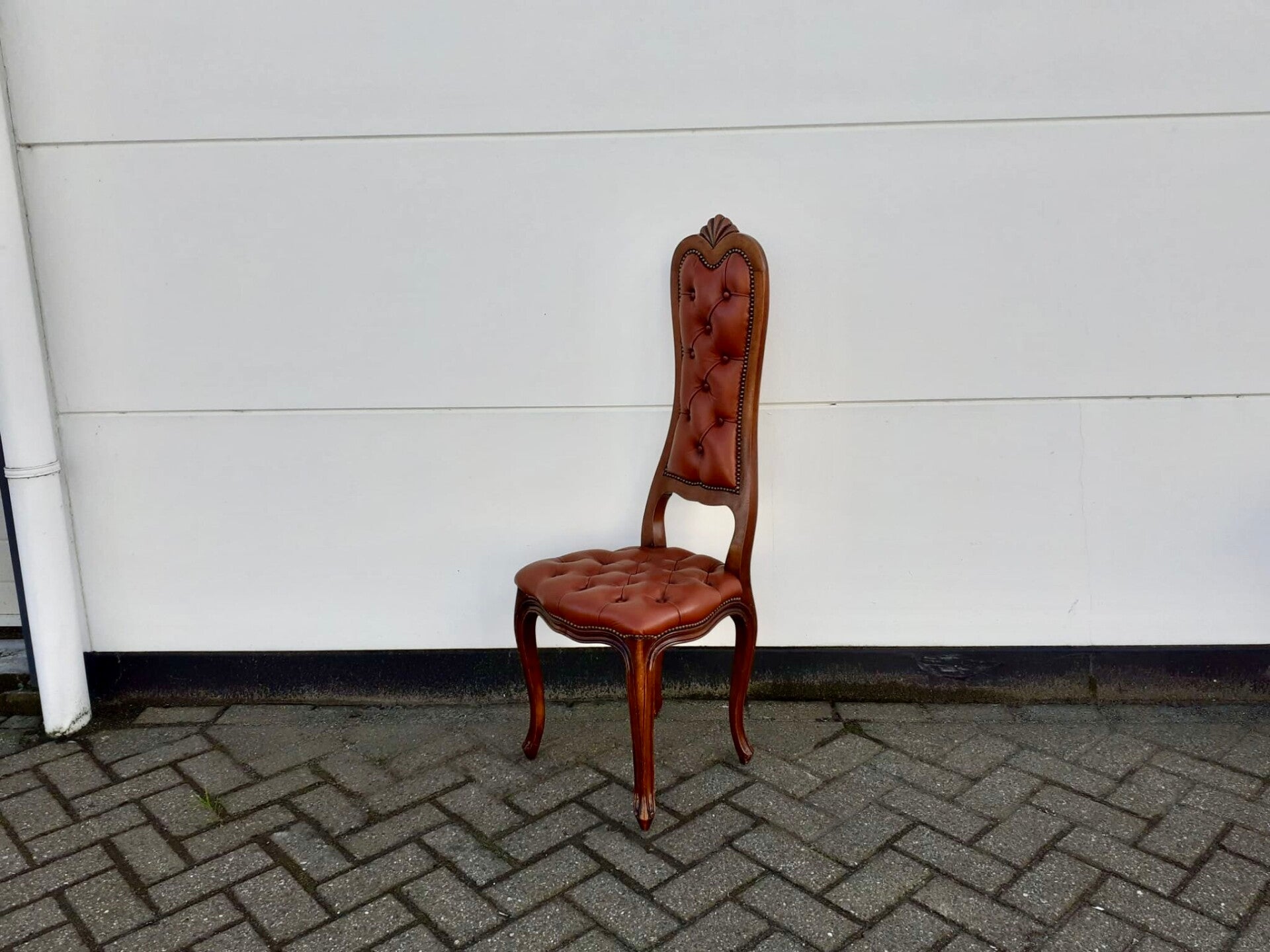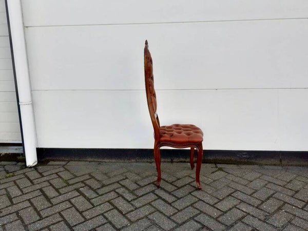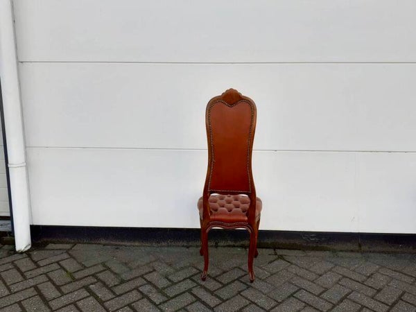 In goede staat, Gecapitonnneerde zitting en rugleuning, Bekleed met bruin leer, afgewerkt met siernagels, Hoogte 116 cm, Zithoogte 42 cm, Breedte 42 cm, diepte 40 cm.