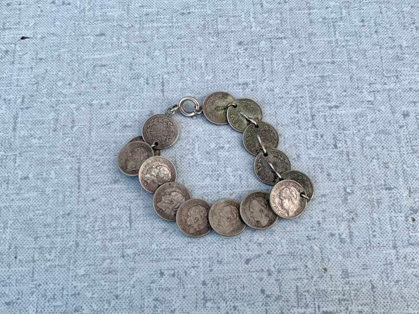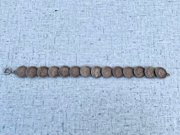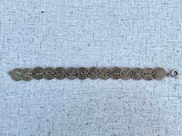 Zilveren Armabnd gemaakt uit Zilveren Dubeltjes uit de regeringsperiode van Koningin Wilhelmina.