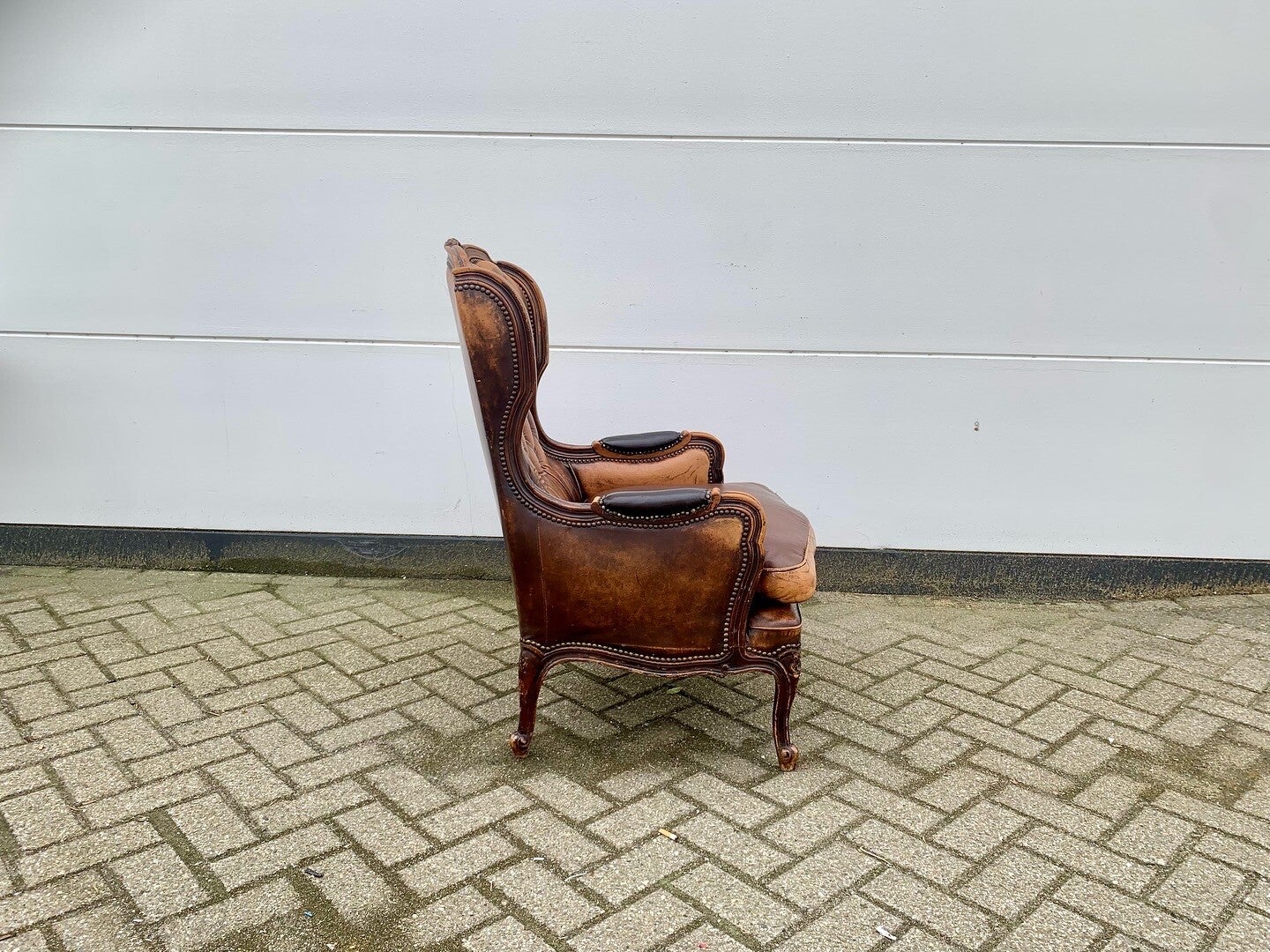Gecapitonneerde rugleuning, Los zitkussen, Armleuningen deels bekleed, Rondom afgewerkt met Koperen siernagels.
