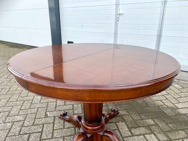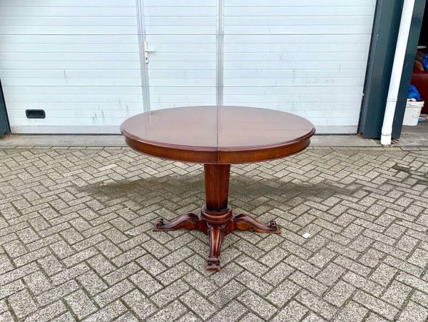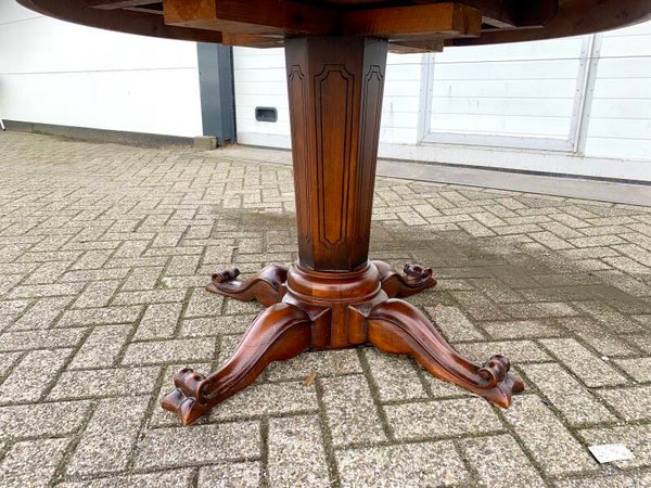 Het ronde tafelblad rust op een taps lopende poot. Hoogte 80 cm.